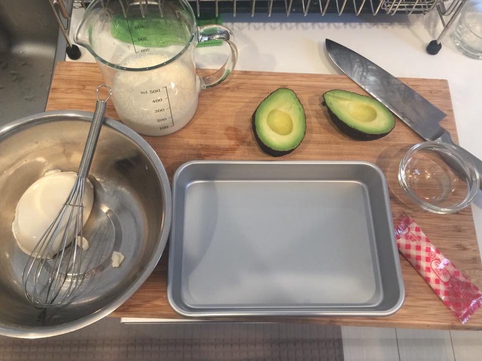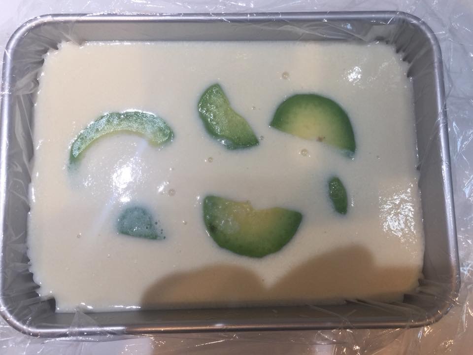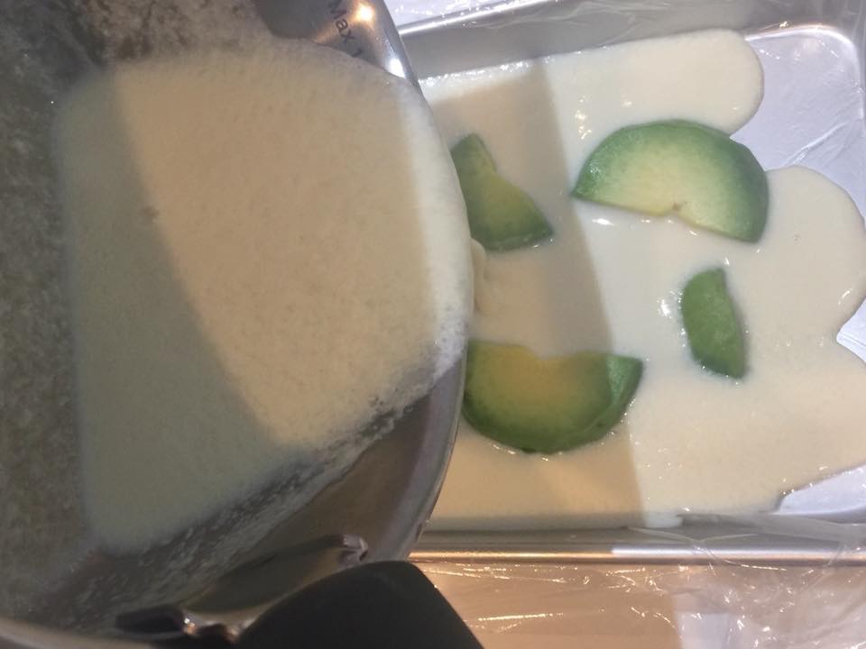 เอาพลาสติกแรปรองก้นถาดพยายามรีดให้พื้นเรียบๆเพื่อความสวยงามจัดเรียงอโวคาโด้ในถาดค่อยๆเทนมถั่วเหลืองลงไปเอาไปแช่ในตู้เย็นจนแข็งตัว